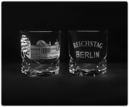 Szklanka do whisky “AGA” o pojemności 325 ml. Wykonana jest z wysokiej jakości szkła. Cała szklanka jest precyzyjnie wypiaskowana. Widnieje na niej REICHSTAG a z tyłu szklanki napis ”BERLIN” oraz REICHSTAG. Zdjęcie przedstawia jedną szklankę ujętą z przodu i z tyłu. Jej kształt z góry przedstawia ośmiokąt foremny a jej dolna część jest dodatkowo ozdobiona wcięciami, co nie tylko ją upiększa ale i sprawia że wygodnie trzyma się ją w dłoni. Idealna pamiątka z Berlina. Ozdobi każdy barek i zachwyci gości. Nadaje się do mycia w zmywarkach.