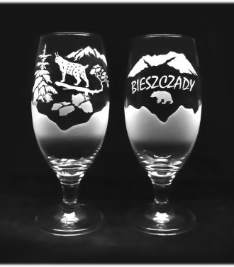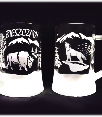 Kufel do piwa ”Miodzio” o litrażu 0,5 litra. Na kuflu są wyżłobione charakterystyczne dla ”miodzia” płaty w szkle. Na środku kufla widzimy metalowy, ogromny odlew wypukły (2D) – wilk. Klasyczny, wygodny kufel, który sprawdzi się u każdego. Idealna pamiątka z Bieszczad.
