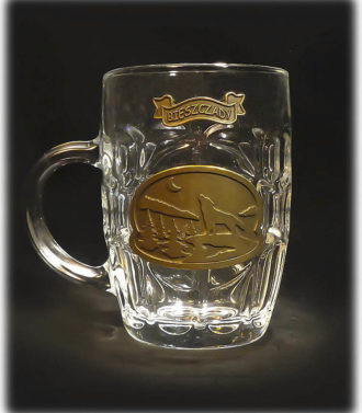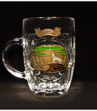Kufel do piwa ”MIODZIO 3” o litrażu 0,5 litra. Na kuflu są wykonane wgłębienia na jego zewnętrznej powierzchni, co sprawia że przenikające przez niego światło, daje efekty świetlne. Na środku kufla widzimy metalowy odlew przedstawiający “wilka na skale”. Odlew jest bardzo okazały i robi wrażenie. Klasyczny, wygodny kufel, który sprawdzi się u każdego. Idealna pamiątka z Bieszczad.