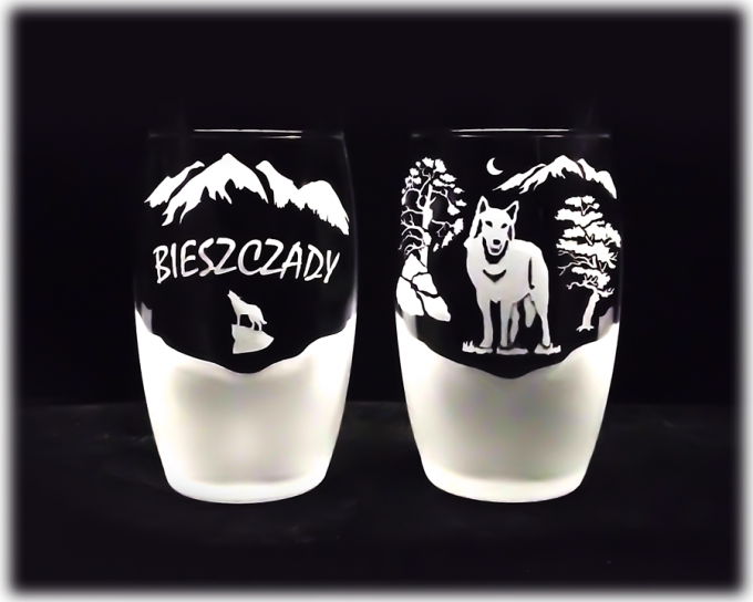 Szklanka do napojów “VERSAILLES” o pojemności 370 ml. Cała szklanka jest precyzyjnie wypiaskowana. Widnieje na niej wypiaskowany samotny wilk oraz z tyłu napis ”Bieszczady”. Bardzo wygodnie utrzymuje się w dłoni dzięki piaskowaniu do połowy.Idealna pamiątka z Bieszczad. Nadaje się do mycia w zmywarkach.