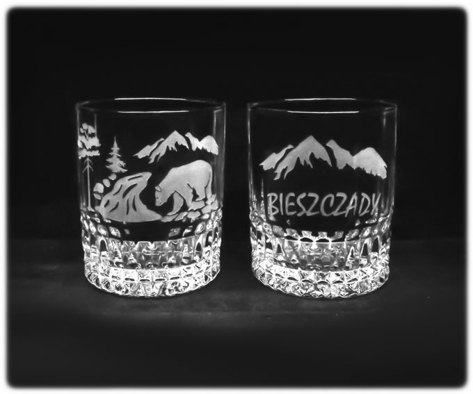 Szklanka do whisky “ELYSEES” o pojemności 300 ml. Cała szklanka jest precyzyjnie wypiaskowana i wygląda jak by była zmrożona. Widnieje na niej niedźwiedź nad potokiem oraz z tyłu napis ”Bieszczady”. Szklanka jest wykonana z wysokiej jakości szkła. Bardzo wygodnie trzyma się w dłoni. Zdjęcie przedstawia jedną szklankę, sfotografowaną z przodu i z tyłu. Idealna pamiątka z Bieszczad. Nadaje się do mycia w zmywarkach.
