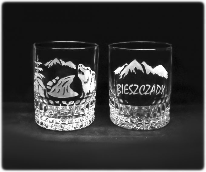 Szklanka do whisky “ELYSEES” o pojemności 300 ml. Cała szklanka jest precyzyjnie wypiaskowana i wygląda jak by była zmrożona. Widnieje na niej głowa wilka oraz z tyłu napis ”Bieszczady”. Szklanka jest wykonana z wysokiej jakości szkła. Bardzo wygodnie trzyma się w dłoni. Zdjęcie przedstawia jedną szklankę, sfotografowaną z przodu i z tyłu. Idealna pamiątka z Bieszczad. Nadaje się do mycia w zmywarkach.