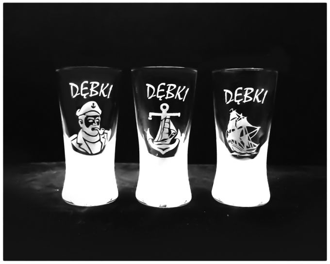 Kieliszek do wódki “X 50″o pojemności 50 ml. Zostały one ozdobione kapitanem,kotwicą oraz żaglowcem. Jest wypiaskowany do połowy jego wysokości, co sprawia wrażenie jak by był zmrożony. Kieliszek o kształcie litery X. Połączenie praktycznej rzeczy z oryginalną pamiątką i ozdobą np w kuchennej szafce czy eleganckim barku, w salonie. Idealna pamiątka z Darłówka. Nadaje się do mycia w zmywarkach.