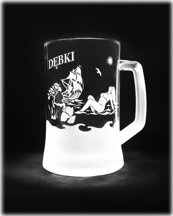 Kufel do piwa ”DOMINIK” o litrażu 0,67l. Jest on ozdobiony z jednej strony. Zadbaliśmy o najmniejsze detale, jest na nim wypiaskowana kobieta oraz w oddali żaglowiec. Znakomicie sprawdzi się jako kufel do codziennego użytku lub jako świetna pamiątka z Dębek. Idealny na prezent dla lubujących się w piwie lub osób, które cenią sobie pamiątki ze smakiem. Ozdobi każde wnętrze i zachwyci gości. Idealna pamiątka znad morza. Nadaje się do mycia w zmywarce.