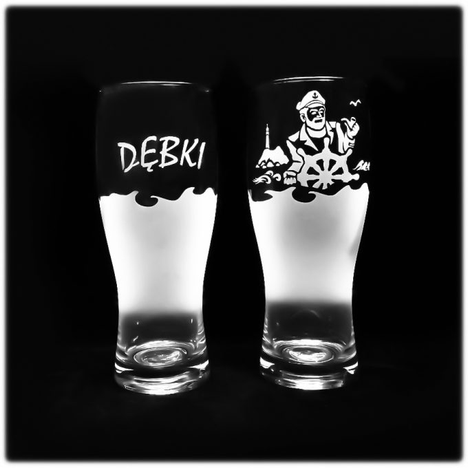 Szklanka do piwa o pojemności 0,5 litra z wypiaskowanym motywem charakterystycznym dla morza kapitanem oraz jest do połowy w szronie. Na szklance widnieje napis ”Dębki” . Zwykła szklanka dzięki precyzyjnemu piaskowaniu nabrała oryginalności. Idealna pamiątka z nad morza. Nadaje się do mycia w zmywarce.