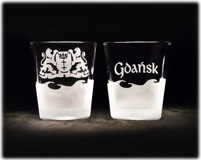 Szklanka do whisky KWADRAT o pojemności 250 ml. Wykonana jest z grubego szkła. Ozdobiona jest motywem Lwów Gdańskich oraz napisem ”Gdańsk”. Bardzo wygodnie utrzymuje się w dłoni. Dzięki piaskowaniu sprawia wrażenie jak by była zmrożona. Idealna pamiątka z Gdańska. Nadaje się do mycia w zmywarkach.