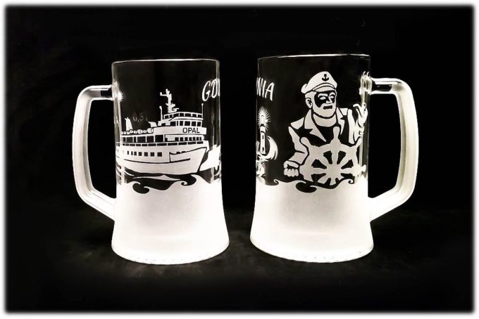 Kufel do piwa ”Ladya” o litrażu 0,67l. Cały kufel jest precyzyjnie wypiaskowany. Zadbaliśmy o najmniejsze detale, jest na nim wypiaskowany prom. Znakomicie sprawdzi się jako kufel do codziennego użytku lub jako świetna pamiątka z Gdyni. Idealny na prezent dla lubujących się w piwie lub osób, które cenią sobie pamiątki ze smakiem. Ozdobi każde wnętrze i zachwyci gości.Idealna pamiątka znad morza. Nadaje się do mycia w zmywarce.