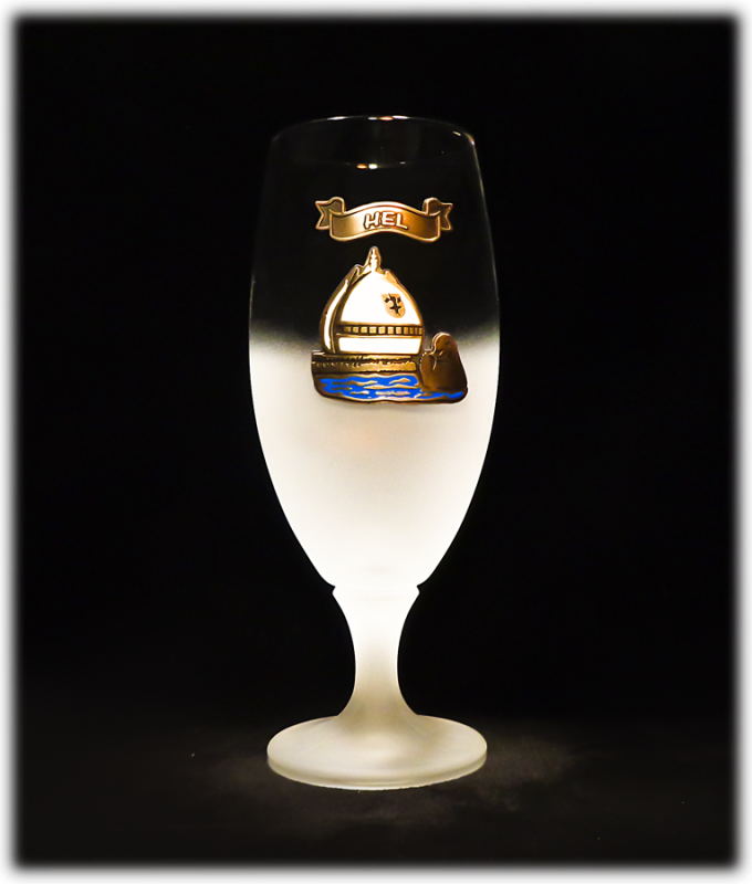 Pokal do piwa “MAŁGOSIA” o litrażu 0,5 litra. Do połowy w szronie, ozdobiony metalowym odlewem w kolorze “Banią” oraz szarfą z nazwą miejscowości Hel . Wypiaskowanie szklanki do połowy jej wysokości sprawia wrażenie, jak by była zmrożona. Przepiękna i dostojna pamiątka z robiącymi wrażenie zdobieniami. Idealna pamiątka z Helu.