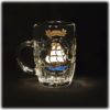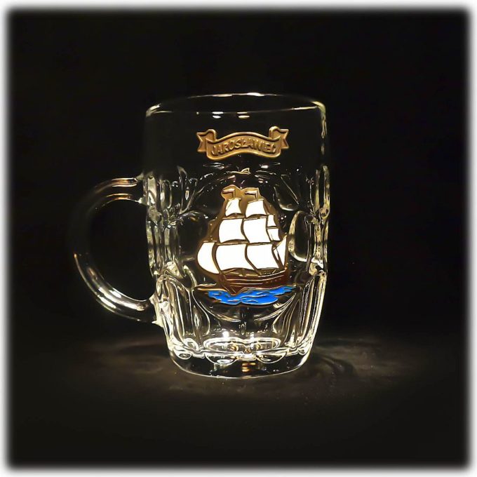 Kufel do piwa ”Miodzio” o litrażu 0,5 litra. Na kuflu są wyżłobione charakterystyczne dla ”miodzia” płaty w szkle. Na środku umieszczona jest metalowy odlew w kolorze żaglowca -“Dragon”. Na pamiątce została umieszczona także szarfa z metalu, z nazwą miejscowości ”Jarosławiec”. Bardzo wygodny, klasyczny kufel do piwa, który dzięki takiemu okazałemu zdobieniu nabrał oryginalności. Idealna pamiątka z Jarosławca.