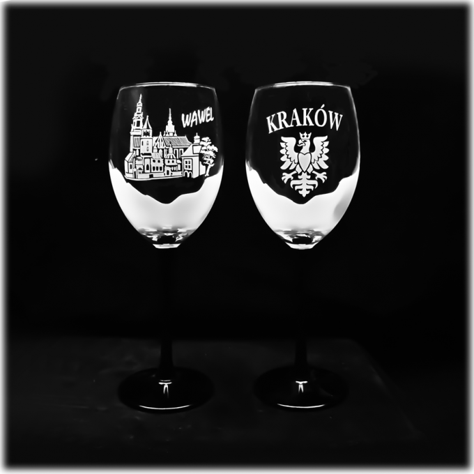 Kieliszek do wina “ADAM” z czarną stopką, o pojemności 330 ml. Elegancki kieliszek, wypiaskowany z motywami typowymi dla Krakowa, Zamkiem Królewskim na Wawelu. Wysokiej jakości szkło, porządne, wygodne dla każdej dłoni. Znakomicie sprawdzi się jako ozdoba w domu, prezent. Dzięki zdobieniu metodą piaskowania, sprawia wrażenie jak by był zmrożony. Idealna pamiątka z Krakowa. Nadaje się do mycia w zmywarce.