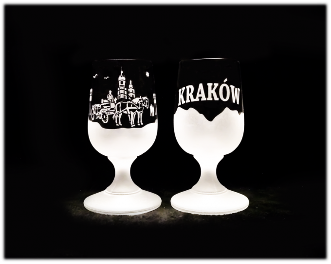 Kieliszek do wódki o pojemności 50 ml. Cały kieliszek został wypiaskowany.Widzimy na nim dorożkę krakowską oraz wypiaskowaną nazwę miasta ”Kraków”. Kieliszek pomimo małego rozmiaru robi ogromne wrażenie.Połączenie praktycznej rzeczy z oryginalną pamiątką i ozdobą np w kuchennej szafce czy eleganckim barku, w salonie.Idealna pamiątka z Krakowa. Nadaje się do mycia w zmywarce.