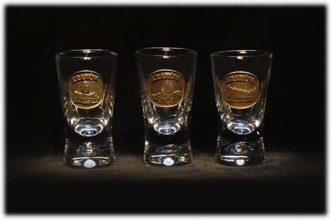 Kieliszek do wódki o pojemności 25 ml. Został on ozdobiony metalowymi odlewami. Kieliszek o kształcie litery X, pomimo małego rozmiaru robi ogromne wrażenie.Połączenie praktycznej rzeczy z oryginalną pamiątką i ozdobą np w kuchennej szafce czy eleganckim barku, w salonie. Idealna pamiątka z Krakowa.