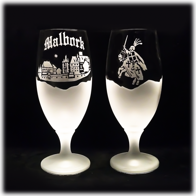 Szklanka do piwa “MAŁGOSIA” o pojemności 0,5 litra z wypiaskowanym motywem zamku krzyżackiego w Malborku wraz z napisem “Malbork” oraz z tyłu rycerzem zakonu krzyżackiego na koniu. Piękna szklanka dzięki precyzyjnemu piaskowaniu nabrała oryginalności. Wypiaskowanie szklanki do połowy jej wysokości, sprawia wrażenie jak by była ona zmrożona. Wykonana jest z wysokiej jakości szkła. Idealna pamiątka z Malborka. Nadaje się do mycia w zmywarkach.