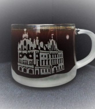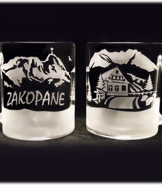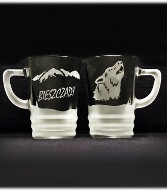 Kubek “KUBAS” o pojemności 400 ml o ciekawym kształcie, sprawia wrażenie jak by stał na spodku, gdy tymczasem jest to jedna całość. Nadaje się generalnie do każdego rodzaju napojów (woda, soki, herbata i kawa oraz inne). Kubek ozdobiony jest metodą piaskowania, co dodaje kubkowi niepowtarzalnego uroku i zarazem zdobienie jest trwałe. Zdjęcie przedstawia jeden kubek, z przodu i z tyłu. Na kubku wypiaskowany jest z jednej strony myśliwy a z drugiej strony jeleń. Każdy szczegół wykonany jest z precyzyjną dokładnością. Widać nawet najmniejsze elementy, dzięki czemu kubek nabrał oryginalnego wyglądu. Idealny prezent dla myśliwego. Nadaje się do mycia w zmywarkach.