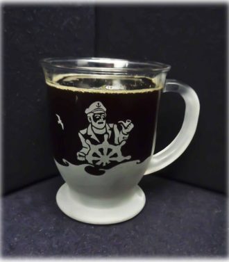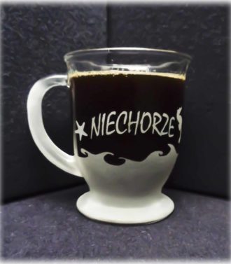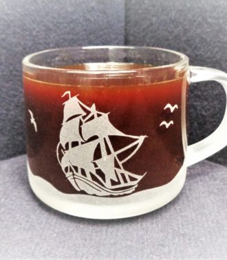 Kubek “KUBAS” o pojemności 400 ml o ciekawym kształcie, sprawia wrażenie jak by stał na spodku, gdy tymczasem jest to jedna całość. Nadaje się generalnie do każdego rodzaju napojów (woda, soki, herbata i kawa oraz inne). Kubek ozdobiony jest metodą piaskowania, co dodaje kubkowi niepowtarzalnego uroku i zarazem zdobienie jest trwałe. Zdjęcie przedstawia jeden kubek, z przodu i z tyłu. Na kubku wypiaskowany jest z jednej strony myśliwy a z drugiej strony lis. Każdy szczegół wykonany jest z precyzyjną dokładnością. Widać nawet najmniejsze elementy, dzięki czemu kubek nabrał oryginalnego wyglądu. Idealny prezent dla myśliwego. Nadaje się do mycia w zmywarkach.