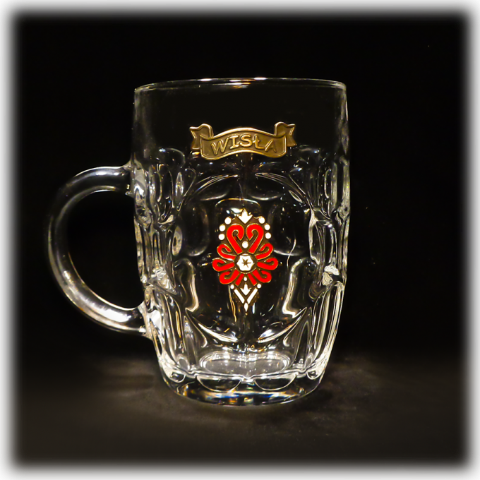 Kufel do piwa ”Miodzio” o litrażu 0,5 litra. Na kuflu są wyżłobione charakterystyczne dla ”miodzia” płaty w szkle. Na środku kufla widzimy metalowy odlew – parzenicę kolorze czerwonym. Klasyczny, wygodny kufel, który sprawdzi się u każdego. Idealna pamiątka z Wisły.