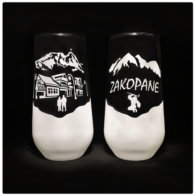 Szklanka do napojów “SPLENDOUR” o pojemności 480 ml. Do połowy w szronie, z wypiaskowanym motywem typowym dla Zakopanego, Krupówki . Piaskowanie sprawia że szklanka sprawia wrażenia jak by była zmrożona. Przepiękna i dostojna pamiątka z robiącymi wrażenie zdobieniem. Idealna pamiątka z Zakopanego. Nadaje się do mycia w zmywarce.