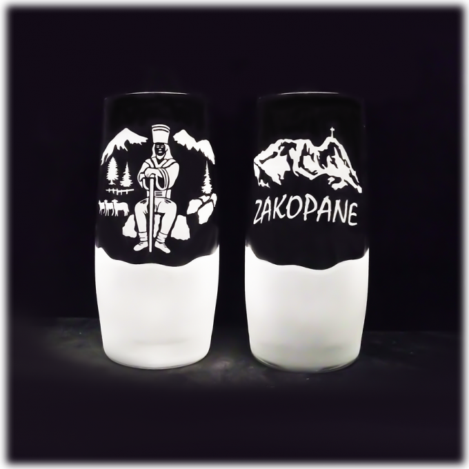 Szklanka do napojów “BLENDED” o pojemności 350 ml. Do połowy w szronie, z wypiaskowanym motywem typowym dla Zakopanego, “JANOSIKIEM” . Piaskowanie powoduje że szklanka sprawia wrażenia jak by była zmrożona. Przepiękna i dostojna pamiątka z robiącymi wrażenie zdobieniem. Idealna pamiątka z Zakopanego. Nadaje się do mycia w zmywarce.