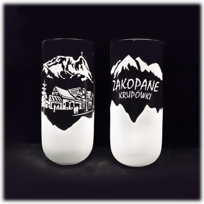 Szklanka do napojów “GLAMOUR” o pojemności 360 ml. Do połowy w szronie, z wypiaskowanym motywem typowym dla Zakopanego, “KRUPÓWKI” . Piaskowanie powoduje że szklanka sprawia wrażenia jak by była zmrożona. Przepiękna i dostojna pamiątka z robiącymi wrażenie zdobieniem. Idealna pamiątka z Zakopanego. Nadaje się do mycia w zmywarce.