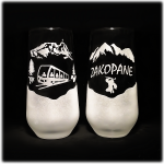 Szklanka do piwa o pojemności 0,5 litra z metalowym odlewem Giewonta oraz do połowy w szronie. Na szklance widnieje napis ”Zakopane”. Zwykła szklanka dzięki piaskowaniu nabrała oryginalności oraz sprawia wrażenie jak by była zmrożona. Idealna pamiątka z gór.