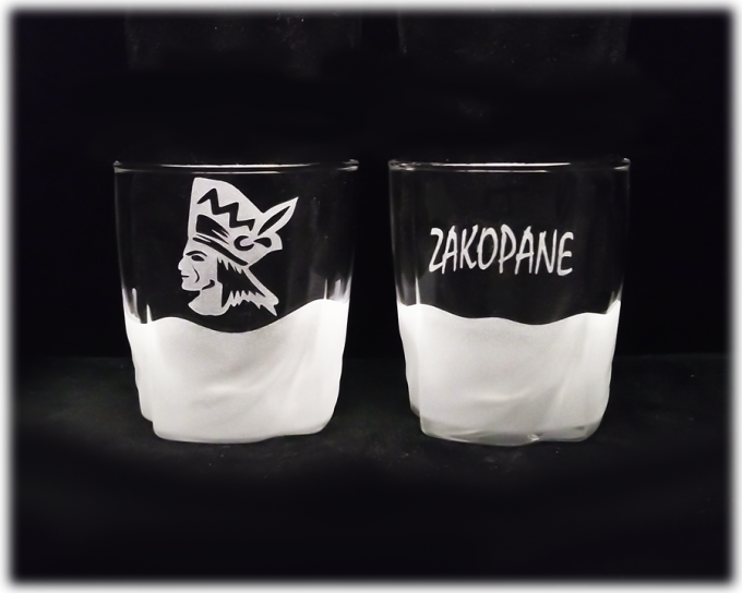 Szklanka do whisky “ASCOT” o pojemności 300 ml. Do połowy w szronie, z wypiaskowanym motywem typowym dla Zakopanego, “GŁOWĄ HARNASIA” . Piaskowanie powoduje że szklanka sprawia wrażenia jak by była zmrożona. Szklanka posiada w dolnej jej części zdobienie skośnymi rowkami. Przepiękna i dostojna pamiątka z robiącymi wrażenie zdobieniem. Idealna pamiątka z Zakopanego. Nadaje się do mycia w zmywarce.