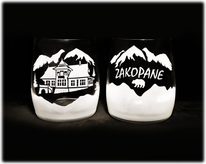 Szklanka do whisky BLENDED o pojemności 250 ml. Do połowy w szronie, z wypiaskowanym motywem typowym dla Zakopanego, “chata góralska” . Piaskowanie sprawia że szklanka sprawia wrażenia jak by była zmrożona. Przepiękna i dostojna pamiątka z robiącymi wrażenie zdobieniem. Idealna pamiątka z Zakopanego. Nadaje się do mycia w zmywarce.