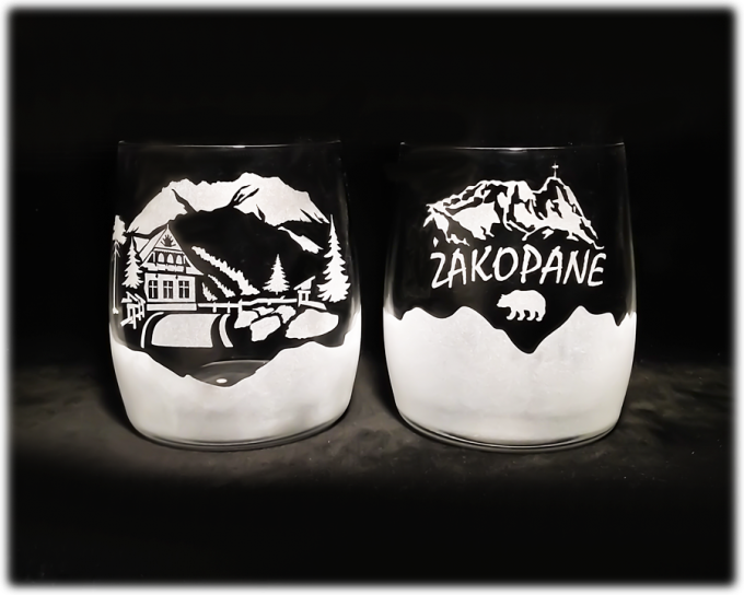 Szklanka do whisky BLENDED o pojemności 250 ml. Do połowy w szronie, z wypiaskowanym motywem schroniska nad Morskim Okiem . Piaskowanie sprawia że szklanka sprawia wrażenia jak by była zmrożona. Przepiękna i dostojna pamiątka z robiącymi wrażenie zdobieniem. Idealna pamiątka z Zakopanego. Nadaje się do mycia w zmywarce.