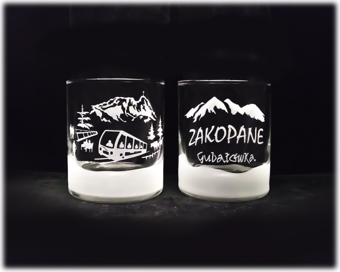 Szklanka do whisky “SUNRISE” o pojemności 300 ml. Do połowy w szronie, z wypiaskowanym motywem typowym dla Zakopanego, “GUBAŁÓWKĄ” . Piaskowanie sprawia że szklanka sprawia wrażenia jak by była zmrożona. Szklanka posiada grube dno, a tym samym jest ciężka. Przepiękna i dostojna pamiątka z robiącymi wrażenie zdobieniem. Idealna pamiątka z Zakopanego. Nadaje się do mycia w zmywarce.